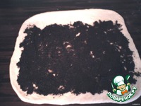 Готовое тесто раскатать и распределить начинку по всей поверхности теста, оставив один край чистым.