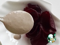 В маленькие порционные тарелочки уложите ломтики свеклы и полейте соусом. |