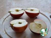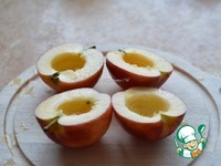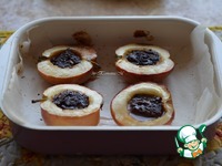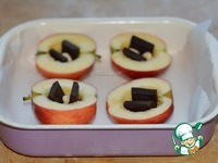 Выложить яблоки в форму на пергамент, в кармашек положить по 2 кусочка шоколада и 2 орешка. |