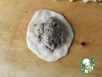 Тесто скатываем колбаской, режем на кусочки, раскатываем каждый кусочек в маленькую лепешечку и кладем ложкой фарш. |