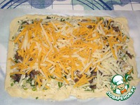 Половину теста раскатать в прямоугольный пласт, толщиной 0,5 см. Раскатывать лучше сразу на бумаге для выпечки, чтобы не добавлять муки. На тесто выложить картофельно-сырную начинку. |