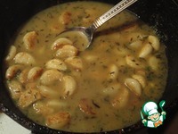 Вливаем вино и апельсиновый сок, а также листья тимьяна. |