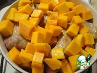 Куски кролика складываем в жаропрочную кастрюлю, перекладывая тыквой. |