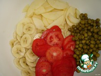 В замесочное блюдо нарезаем помидоры - кружочками бананы - кружочками яблоки - дольками (без кожуры) зеленый горошек |