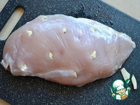 Чеснок нарежьте пластинками. Индюшиную грудку обмойте, обсушите бумажным полотенцем и нашпигуйте чесноком по всей поверхности. |