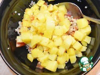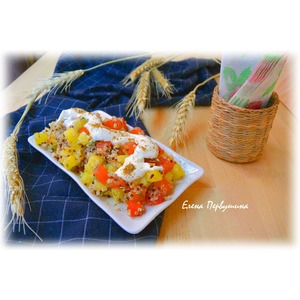 Киноа отварить в большом количестве воды до готовности. Слить воду. |
