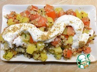 Выложить салат на блюдо. Подавать со сметаной, приправленной солью и кориандром. |