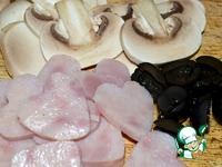 Сыр натереть на терке, шампиньоны нарезать пластинами, маслины пополам, из ветчины вырезать фигурки или просто нарезать. |