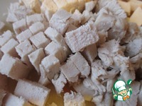 Сварить бульон из куриной грудки. (у меня во второй воде)Вынуть мясо из бульона и отложить в сторону остужаться. Потом его нарезать на небольшие кусочки. |