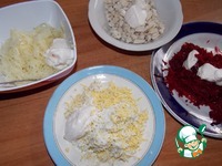 Все овощи натереть на мелкой тёрке по отдельности, добавить в каждый овощ немного майонеза, перемешать и посолить по вкусу. |