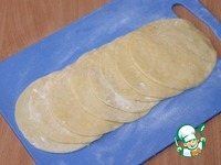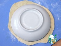 4. Каждый шарик тонко раскатать (Не припыляем разделочную доску!), и вырезать при помощи чайного блюдца круг. |