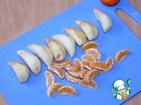 6. Очищаем груши от кожуры и семечек, разрезаем на 8 частей. Если у вас груши крепкие, можно разрезать их в виде гармошки. Мандарины лучше взять покислее, очистить и разделить на дольки. |