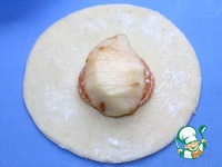 7. Середину круга смазываем мягким маслом и кладем кусочек груши, по бокам для вкуса и устойчивости две дольки мандаринки. Смазываем край круга белком |