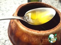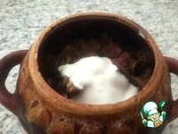 Потом достаем горшочек, и добавляем сметанку, одну столовую ложку. Ставим обратно в духовку на 20 минут. |