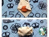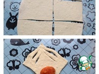 Боковые углы загнуть на начинку, и начать сворачивать булочки рулетом, с низа (где начинка), доходя до разрезов. |