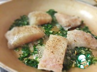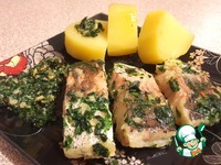 Стейки или филе хека обсушить бумажными полотенцами, слегка посолить и приправить специями. Нарезать мелко петрушку (получится 3-4 ст. л) и так же мелко нарезать чеснок. |