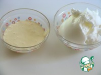 Взбить желтки с сахаром в пышную белую массу, белки - до устойчивых пиков. |