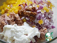 3. С тунца слить масло. В чашке смешать тунца, лук, перец, горчицу и сыр. |