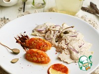Описание: Холодная закуска из куриного филе с соусом из тунца и икрой из овощей по мотивам телятины "Вителло тоннато". Одна из любимых нами закусок. Очень вкусно, готовится совсем просто и на праздничном столе займет достойное место. Можно подать как на блюде для домашнего ужина, так и порционно для гостей.