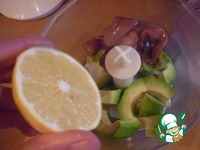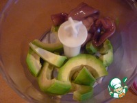 Авокадо очистить, мякоть нарезать ломтиками и выложить в чашу блендера (я добавила ещё молоки сельди). |