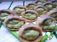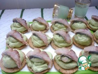 С помощью кондитерского шприца или просто ложкой выложить массу на крекеры. Сельдь нарезать кусочками и положить по кусочку на каждую порцию. |