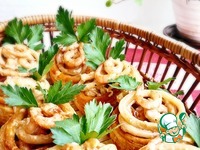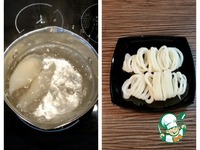 Филе кальмаров отварите в кипящей подсоленной воде 3-5 минут, откиньте, охладите, нарежьте кружочками. |