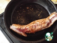 Подготовить мясо, у меня телячья вырезка, обмыть, срезать пленку, натереть солью и специями (у меня специальные специи для говядины) |