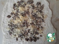 Раскатать тесто, выложить грибы, посыпать сыром |