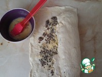 Выложить мясо на тесто и завернуть, как рулет, смазов края яйцом. Смазать яйцом и сделать надрезы, чтобы выходил пар. |