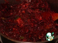 Все тушим медленно, вдыхая ароматы. Великолепно пахнет чесночок. Минут так через семь, а может десять... Добавим к ним натертый бурячок. |