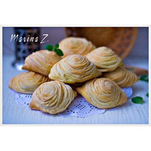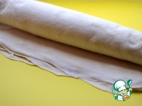 Формовка. Положить получившийся маленький рулетик срезом на рабочую поверхность. Пальцами надавить посредине, формируя ямочку. В эту ямочку положить начинку. Края заготовки соединить, хорошо защипнуть, как у пирожков, но не тянуть сильно, чтобы не испортить рисунок слоев. Перевернуть заготовку швом вниз, придать форму. Нужно, чтобы получилась выпуклая лодочка. |