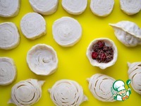 Начинка: вяленую вишню залить кипятком, оставить минут на 5. Промыть, обсушить на бумажном полотенце. Миндаль и грецкий орех измельчить в кофемолке (орехи могут быть любые, на ваш вкус), добавить сахар, кардамон, хорошо взбитый белок (не обязательно, т. е. белок можно и не добавлять). Перемешать. Можно сразу соединить вишню с орехами, а можно добавлять по отдельности уже в заготовку, разницы нет. В традиционной бадамбуре вишни в начинке нет, но мне очень хотелось ягодной нотки, кислинки.