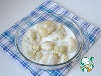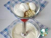 Готовую, горячую цветную капусту, яйца, маскарпоне (я заменила его жирной сметаной), соль, перец, отжатый желатин сложить в одну чашу и пробить блендером. |