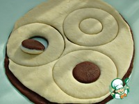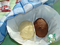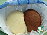 Тесто разделить на две равные части. В одну часть добавить 2 ст. л. какао - порошка и тщательно замесить. Обе части накрыть полотенцем и поставить в теплое место для подъема. |