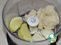 3. Батон размочить в молоке или воде. В процессоре измельчить сельдь, яблоко, лук, батон. Обычно форшмак прокручивают через мясорубку, я пробила в процессоре. |