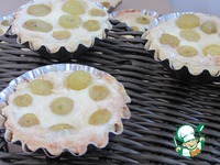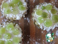 В тарталетки со сладкой начинкой выкладываем сыр посыпаем сахарной пудрой. Затем сливки выкладываем и разравниваем по поверхности. Сверху кладем виноград и посыпаем сахарной пудрой. |