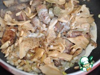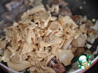 Добавляем порезанные шампиньоны, у меня варёные, обжариваем 5 минут. |
