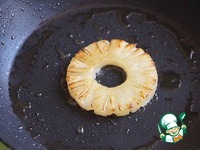 На раскаленную сковороду наливаем 1 ст. л. растительно масла и обжариваем на нем ананас с одной стороны пару минут, переворачиваем, подвигаем ананас строго на центр сковороды |