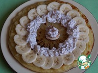 И вливаем внутрь колечка ананаса и за его пределы блинно-банановую смесь. Я накрываю крышкой сковороду и уменьшаю огонь - блинчик получается достаточно толстым. |