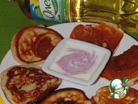 Для соуса смешать сметану и черничный джем. Сладкие творожные оладьи с нежным, чуть-чуть кисловатым соусом готовы. |