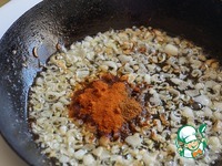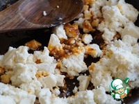 Добавляем раскрошеннный адыгейский сыр и обжариваем его, постоянно помешивая. |