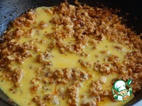 Вливаем молочно-яичную смесь и очень быстро и тщательно перемешиваем. Жарим еще минуты 4 - готово. |