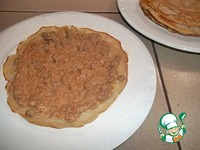 Напечь тонкие блины (у меня на кефире). На 2 блинных пиццы понадобится 8 небольших блинов. |