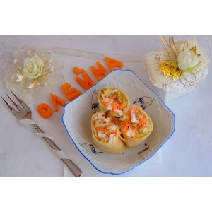 Напеките блинов по своему любимому рецепту и заверните начинку. |
