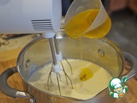 После этого тонкой струйкой влить оливковое масло, интенсивно взбивая венчиком или миксером на небольшой скорости до однородности. |