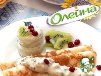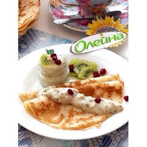 Для блинчиков просейте в миску муку, добавьте соду и соль, влейте кефир, добавьте мёд и 2 ст. л. масла "Олейна", начните замешивать тесто. Затем добавьте яйца, размешайте тесто, чтобы не было комков. |