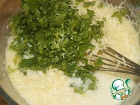Всыпать оставшуюся муку, натертый на мелкой терке сыр и рубленную зелень. Перемешать тесто. |