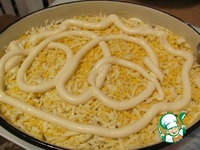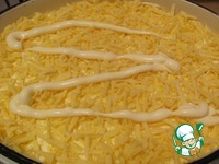 Смешать сыр с давленым чесноком и половину выложить следующим слоем, опять же хорошо удобрив майонезом |