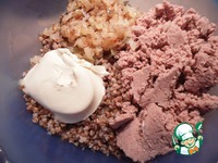 Смешать гречку, лук, паштет и сливочный сыр. |