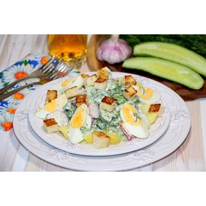 Редис, огурцы и щавель смешать со сметанной заправкой. Выложить овощную смесь поверх картофеля. Поперчить. Украсить дольками сваренных вкрутую яиц и гренками. |